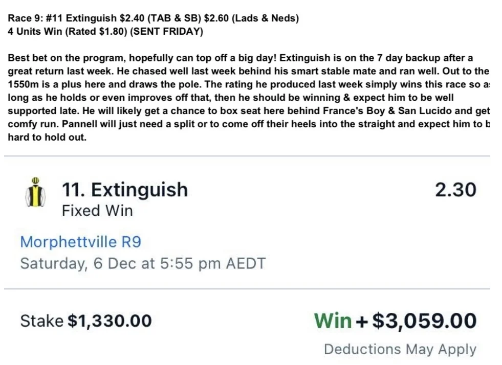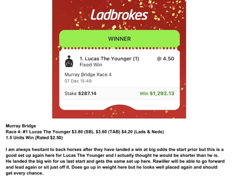 I have been betting and completing detailed form analysis for South Australian racing for the past 5 years. Whilst always a fan of sport & horse racing my whole life, it’s the past five years where I have taken my love of sport & racing to the next level and began detailed form. I see plenty of edges in betting in South Australia racing despite the public perception at times. Utilising a high detailed racing database that produces ratings of each runner, I am able to use this data to my advantage in setting & analysing betting markets. With SA racing being a smaller market, it can provide a better edge to punters when knowing how markets will react to stables, jockeys, tracks & horses. I pride myself on race maps & analysing tracks & how they will play to provide myself with the edges needed whilst also having a focus on betting early when markets open to get an edge on the market. I also personally own shares in up to a dozen horses across the state & have owned plenty in the past 10 or so years which also shows my passion for local racing. I love finding edges in the markets and am happy to back horses whether they rate as $2 chances or $101, wherever I can an edge, i will attack!