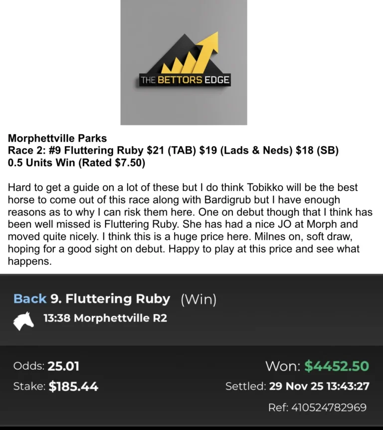 The Bettors Edge was created to be a punter’s best friend — a reliable tool for beginners and professionals alike. In a space filled with scams and low-quality tipping services, we aim to be the difference. We connect you with Australia’s sharpest punters across all sports and racing codes, helping you bet smarter, avoid the traps, and make informed decisions with confidence.